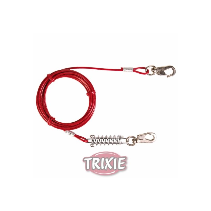 Cable plastificado con muelle, 5 mtrs. Este cable con muelle amortiguador tiene una capa de plástico resistente a la intemperie. No todos los propietarios de un perro tienen una caseta o quiere construir una valla de metros de altura alrededor de su propiedad. Este cable ofrece una solución óptima para que el perro tenga su espacio para correr. Es más seguro y más fuerte que la mayoría de las cadenas y el sistema de absorción de golpes protege a su perro de las lesiones. La capa de plástico hace el cable sea rígido lo que protege al perro de estrangularse. Por otra parte, la capa de plástico evita la corrosión y hace que sea fácil de limpiar. Sin embargo, siempre debe ser consciente de que el cable es una solución a corto plazo. No sustituirá a pasear al perro. El cable no es para uso permanente.