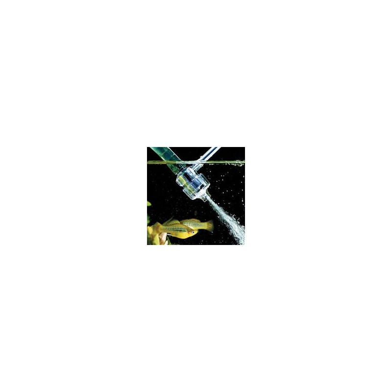 El pequeño aparato se monta en el extremo de la manguera de entrada tocando justo la superficie del agua y se fija en la pared de la pecera de tal manera que se cree un ángulo de inyección lo más plano posible. Ello permite obtener, al mismo tiempo, un buen movimiento del agua. La manguera de aire del difusor se conduce a un punto fuera del acuario. Con ayuda del borne de regulación de presión adjunto se puede dosificar la cantidad de aire aspirado en función de las necesidades. El aparato mezcla la cantidad de aire suministrada con el agua entrante, que es proyectada debajo de la superficie del agua por la presión de la bomba del filtro.