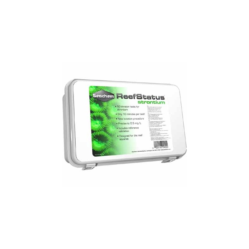 Reef Status Strontium mide el Estroncio separándolo antes por precipitación y filtración química, seguida de una interpretación muy sensible que puede dar lecturas a intervalos de 0.5 mg/l.