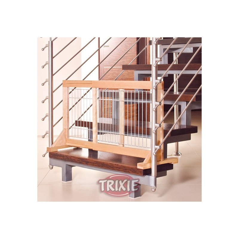 - Medidas: · Longitud: Regulable de 63 a 108 cm. · Alto: 50 cm. · Ancho: 31 cm. · Distancia entre barrotes: 3.2 cm. - Para perros pequeños y cachorros. - Realizado en madera de abedul barnizada. - Barrotes galvanizados. - Bloquea el acceso a habitaciones, escaleras... - Regulable. - Antideslizante por los pies de caucho.