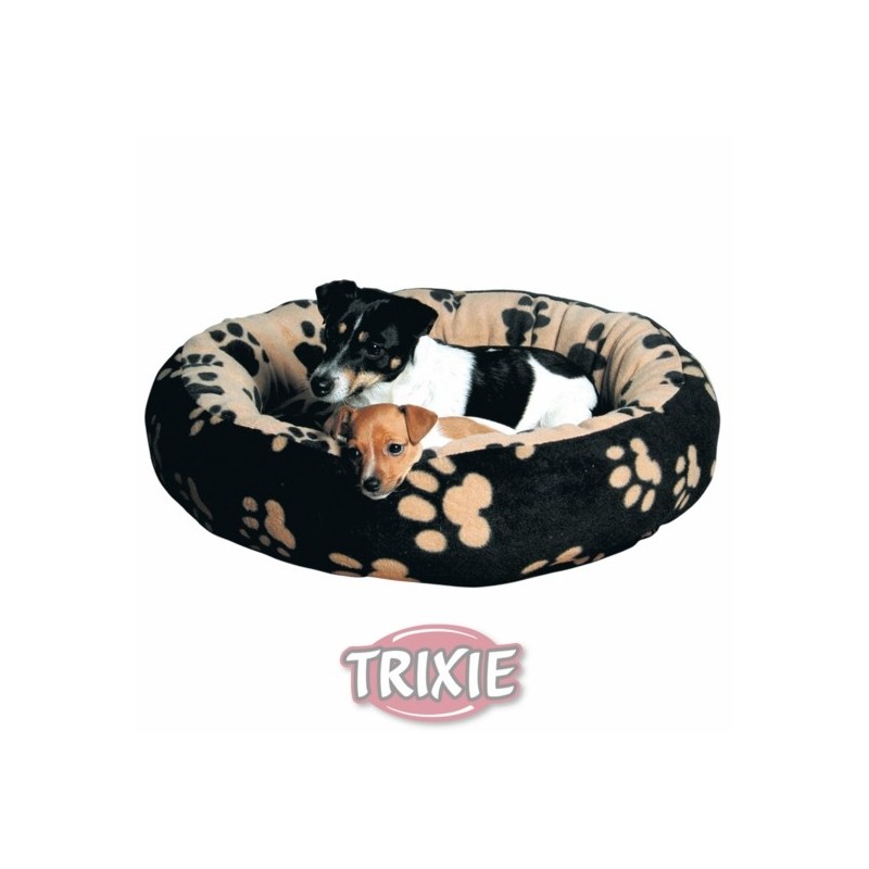Cuna Sammy, felpa, relleno poliester, lavable 30º NEGRO-BEIGE con huellas. Esta cama para perros tiene una cubierta de felpa suave y cómoda y un relleno polar de poliéster. Se puede lavar hasta 30 ° C.