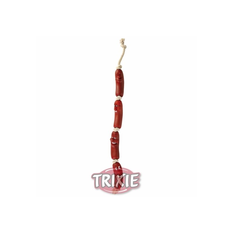 - Medida: · Longitud: 75 cm. - Hecho de vinilo. - Ristra de 4 salchichas. Los juguetes de vinilo están realizados con plástico bastante flexible. Estos juguetes son de limpiado y uso sencillo. Deben asegurarse de que los juguetes rotos se sustituyan inmediatamente dado que los trozos no se deben tragar. Vigile a su perro mientras juega.