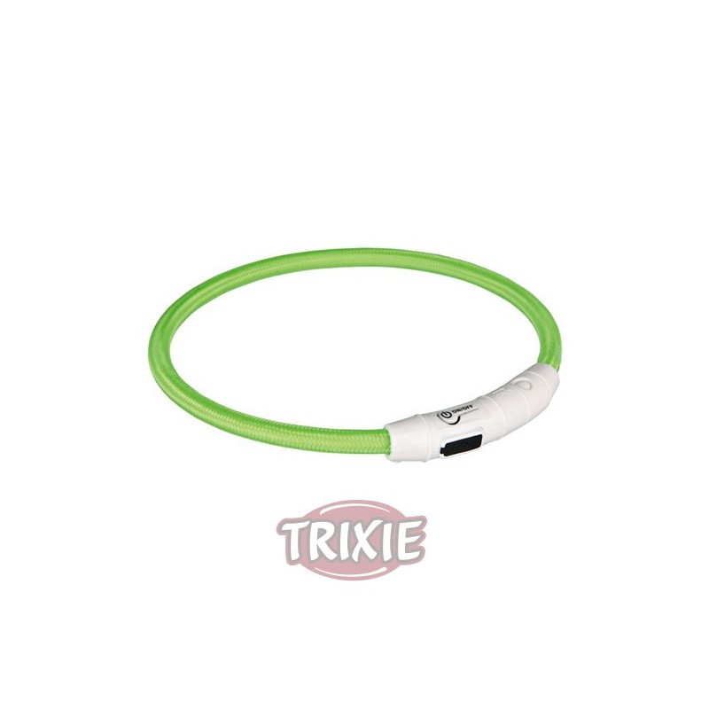 - Largo: 35 cm. - Hecho de PVC/nylon. - Con 2 modos de luz: flash (intermitente) y continua. - Recargable mediante cable USB. - Talla individualizada adaptable con un simple corte. - Resistente al agua. - 8 h aprox. de batería con luz intermitente, 5 h con luz continua. - Incluye cable USB y destornillador. - Color: Verde.