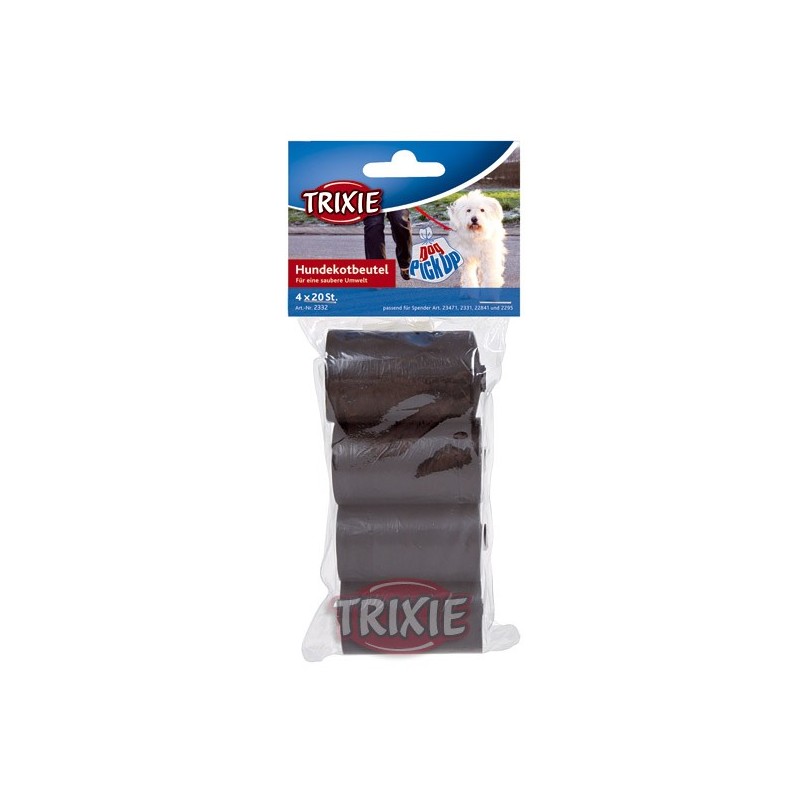 - Talla: M. - Contenido: 4 rollos de 20 bolsas. - Hecho de plástico. - Recambios para dispensadores de bolsas (ref: 2295, 2331 y 22841). - Color: Negro. Doggy Pick Up es la gama de dispensadores y bolsas de basura de Trixie. Abre una bolsita y úsala como si fuera un guante. Recoge la basura, cierra la bolsita y tírala a la papelera.