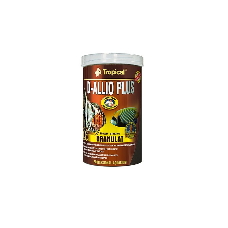En la fórmula de D-Allio Plus Granulat se ha utilizado las propiedades del ajo (Allium sativum L.), ya conocidos y respetados desde mucho tiempo. Este complemento natural refuerza los organismos de los peces y favorece los procesos digestivos. Un alto valor nutritivo del alimento, una serie de vitaminas y microelementos seleccionados de la manera óptima y las propiedades del ajo hacen que D-Allio Plus Granulat es un alimento indispensable durante las curaciones, convalecencias de los peces y su aclimatación a las condiciones nuevas. Para variar las dietas de los discos y otros peces exigentes se recomienda la utilización de D-Allio Plus Granulat alternativamente con otros alimentos de la marca Tropical, por ejemplo Regular, D-50 Plus, Astacolor.