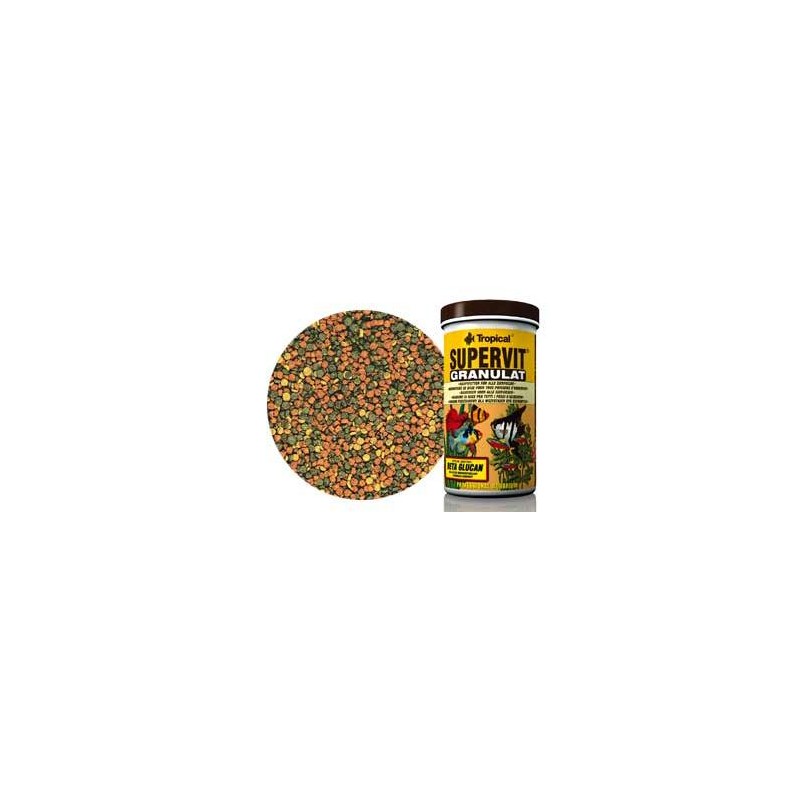 Tropical Supervit Granulat es un alimento en granulos de alga calidad, completo y multi-ingrediente, elaborado para la alimentación diaria de todos los peces del agua de agua dulce. Sus ingredientes están diseñados para cubrir las diferentes necesidades nutricionales de los peces mantenidos y criados en tanques multi-espe