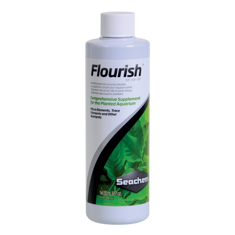 FLOURISH es un estimulador de crecimiento para las plantas y hojas del acuario. Contiene una extensa gama de elementos traza esenciales, vitaminas y amino ácidos. Flourish es rico en hierro gluconatado, manganeso, calcio, magnesio, potasio, inositol, choline B12, biotina, y otros factores determinantes beneficiosos para las plantas acuáticas.