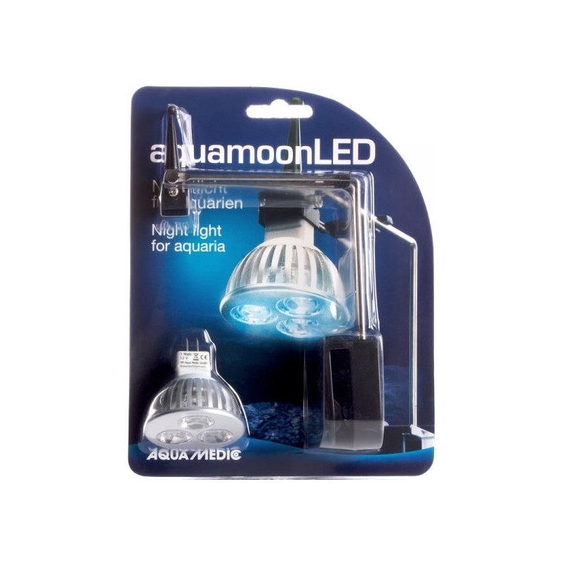 El aquamoon LED está equipado con un azul aquasunspot 3 x 1 con 3 W con una radiación de luz azul fluorescencia de profundidad. El uso de una luz de la luna de este tipo permite la observancia de los animales nocturnos y reduce la facilidad sorprendente de los peces que también evita que los peces saltan a cabo por la noche. Asimismo, la reproducción y el crecimiento de los corales se verá influido por la luz de la luna. El aquamoonLED se lleva a cabo por una tensión de seguridad de 12 V. Los LED del azul aquasunspot 3 x 1 tienen una durabilidad de 50.000 horas. Un transformador de 12 V y un soporte apropiado con clip de montaje para los paneles de vidrio de 6-8 mm de tamaño de cristal se incluyen en la entrega.