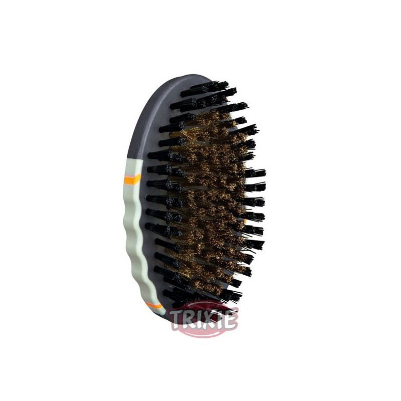 - Medidas: · Ancho: 7 cm. · Alto: 12 cm. - Actúa sobre el manto y el subpelo. - Con cerdas de nylon. - Con agarre antideslizante de goma. - Ref. 2319 con cerdas adicionales de latón. Apto para los siguientes tipos de pelaje: - TIPO 4 (Pelo corto, liso o gatos de pelo corto): Pelo corto a medio largo, capa superior de pelo brillante y subpelo fino, suave y de espeso a muy espeso. Ejemplos: Labrador Retriever, Rottweiler, Carlino, Pastor Alemán, Husky, Gato Europeo pelo corto, Exótico pelo corto, Cartujo, Siamés. - TIPO 5 (Pelo Suave): Manto corto, suave y brillante; sin subpelo. Ejemplos: Dálmata, Mastiff, Dóberman, Pinscher, Boxer, Rhodesian. - TIPO 6 (Pelo Duro): Manto duro, grueso y áspero; con subpelo corto, blando y grueso; se debe tratar periódicamente. Ejemplos: Teckel de pelo duro, Terrier de Airedale, Cairn Terrier, Fox Terrier, Schnauzer. Información sobre el cuidado del pelo: El cuidado regular del pelo del perro es muy importante. Recomendamos que se cepille el pelo del perro por lo menos una vez a la semana ya que el cepillado también activa la circulación de la sangre, lo que ayuda a que su pelo este sano y brillante. Además, al cepillarlo podrás ver si tu perro tiene pequeñas heridas o parásitos.