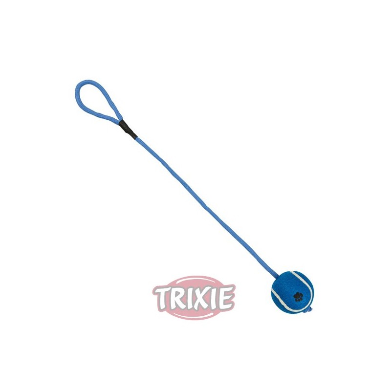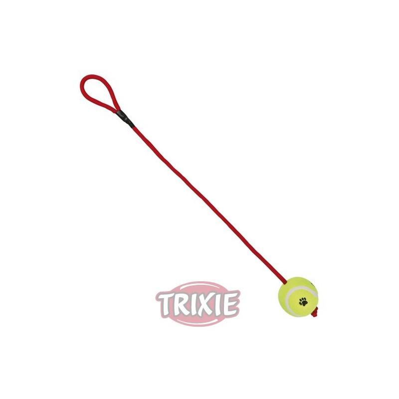 - Medidas: · Diámetro: 6.5 cm. · Longitud: 50 cm - Pelota tenis con cuerda. - Puede ser lanzada con facilidad. - Garantiza horas de juego y diversión para el perro y su amo. - Color: varios. IMPORTANTE: No permita que su perro juegue sin supervisión. No se utiliza gas para el llenado de las pelotas de tenis del programa de ventas TRIXIE y no contiene ninguna fibra de vidrio en la superficie. Esto protege la dentadura de su perro.