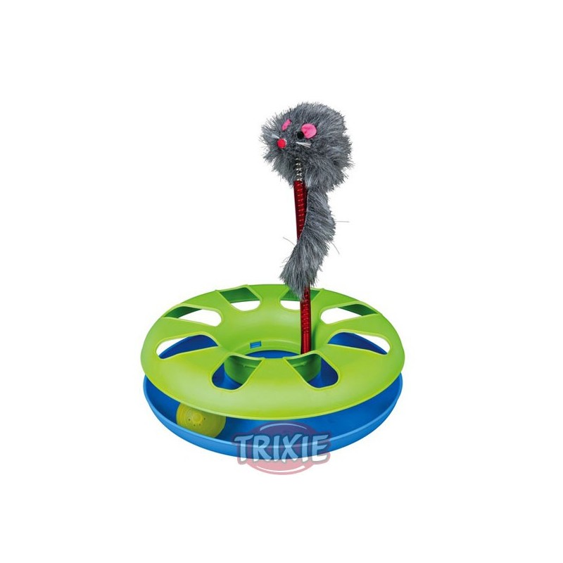 - Diámetro: 24 cm. - Hecho de plástico. - Con ratón de peluche sobre muelle y pelota de juego. El ratón de peluche enganchado a la parte superior de este juguete y la bola que se mueve dentro del anillo despertarán el instinto de caza del gato.
