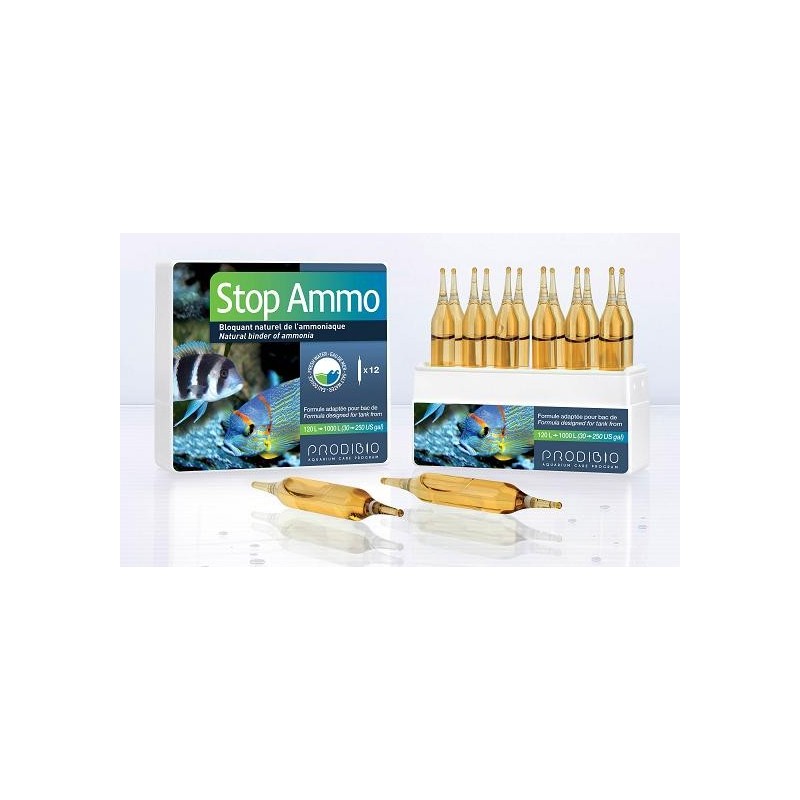 Stop_Ammo es eficaz en agua dulce y agua marina y es una planta natural que neutraliza el amoniaco y reduce la producción de nitritos en el acuario y el agua utilizada para el transporte de pescado.